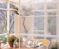 タチカワブラインドシルキーの出窓対応ブラインド。2連窓、3連窓も角度調整は1ヶ所で操作可能。