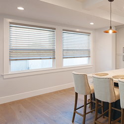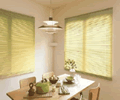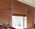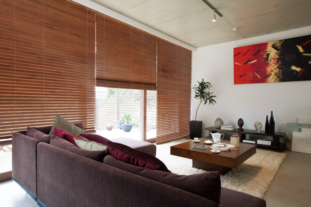 ニチベイの木製ブラインド。天然木(バスウッド)のほか木の質感を限りなく再現したクラフト・グレイン、アンティーク・ラスティックのほか、防炎・耐水タイプ、電動タイプあり。昇降操作が軽いループコード式が特徴。