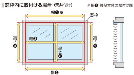 窓枠内天井付けにした場合、納まりがスッキリとします。製品の幅・高さ共に窓枠の内側寸法から約10mmほど引きます。