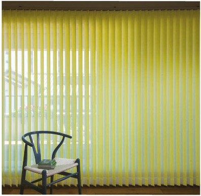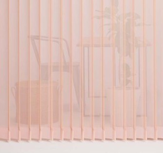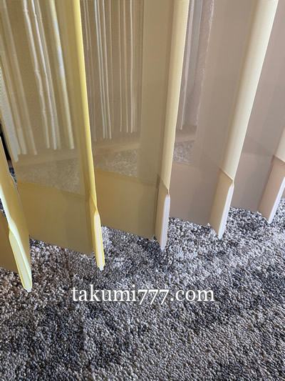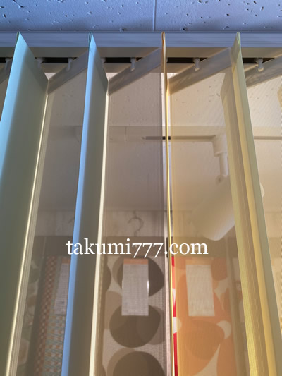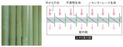 縦型ブラインド・バーチカルブラインドの中でも人気があるのがセンターレーススタイルです。不透明生地とシースルー生地が1枚おきに交互に吊り下がっていて、不透明生地が窓の面と垂直前後になったとき、シースルー生地が45°くらいの角度で止まり正面から見ると不透明生地が見えず、レース状に見える画期的な製品です。図にすると下記のようになります。