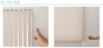 ループコード式:全体の開け閉めをループコードで、ルーバーの回転をポールで行います。片開き・両開きを選べます。立ったその場で開け閉めの操作ができますのでレールが長い場合に便利です。コード式にはコードを束ねて収納できるコードウェイトが標準装備。小さなお子様がいらっしゃるご家庭でも安心して使えるチャイルドセーフティー機能もついています。