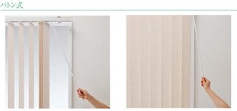 バトン式:全体の開閉とルーバーの回転操作を1本のバトンで行います。片開きのみの対応となります。ループコードがない分すっきりとして子どもにも安全ですが、開け閉めは自分もいっしょに動かなければなりません。