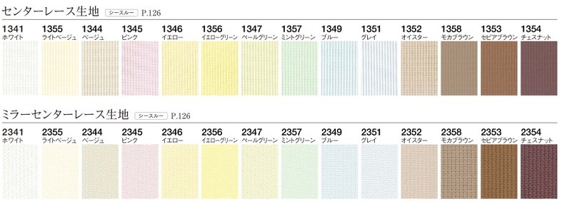 センターレース生地は通常のシースルー生地と日中外からの光を反射して室内を見えにくくするミラーセンターレース(製品価格5%UP)の2種類あります。