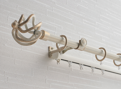 アンティーク調の装飾レールでヴィンテージ・ナチュラルなインテリアに良く似合います。リングランナーが中央のブラケットを通過できるブラケットスルー機構の採用で、3m以上の大開口サッシや幅広レールの片開きも対応可能となりました。 |