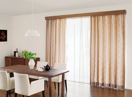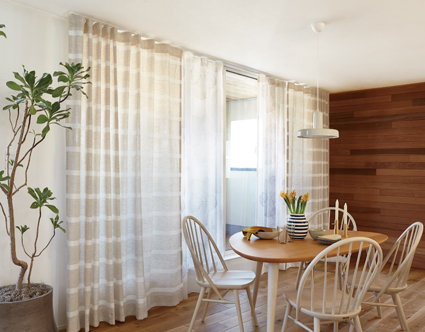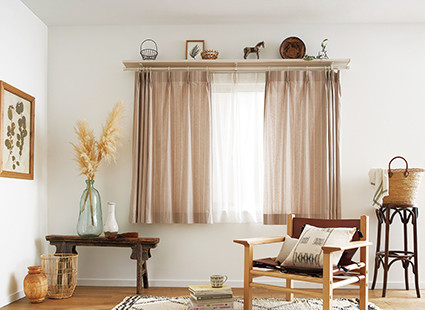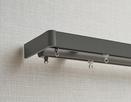 無垢パイン材の天然木をドレープ側のレールに使用した意匠性の高いカーテンレールです。上からの光漏れを抑えるカバートップ仕様もあります。 |