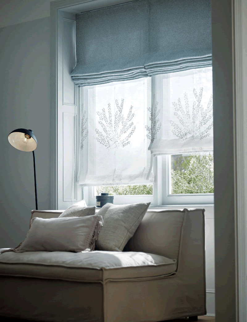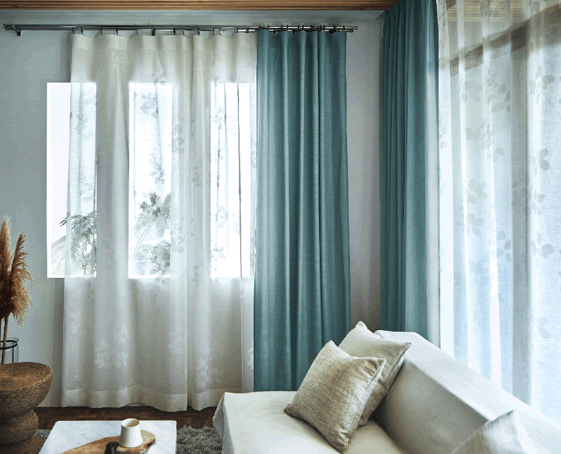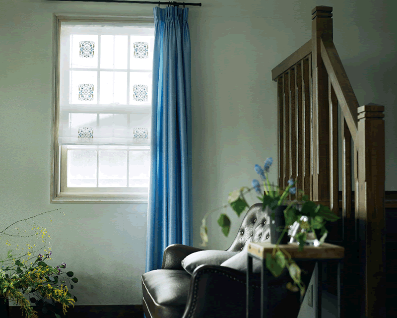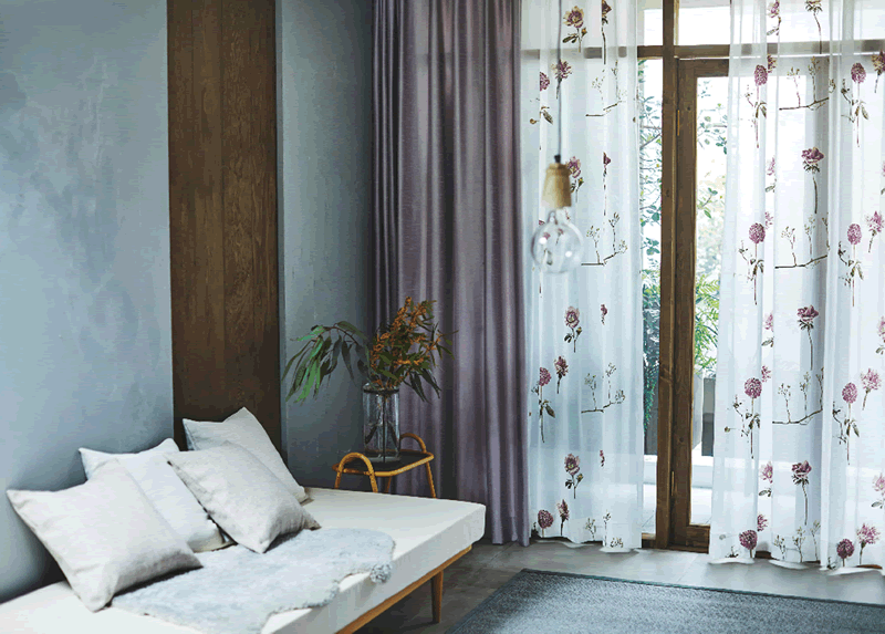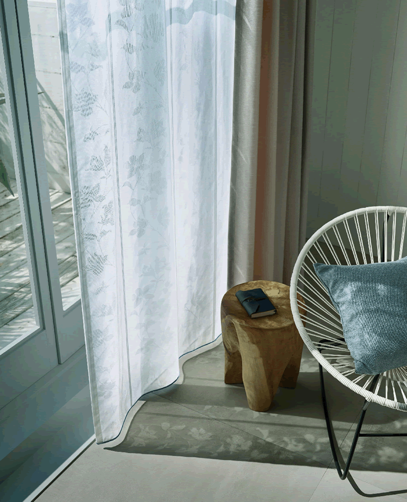 更紗模様をエンボスプリントした透け感で手触りと光沢の美しいボイルカーテンです。植物の模様がほんのりと浮かびます。
