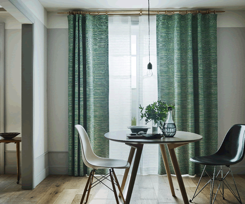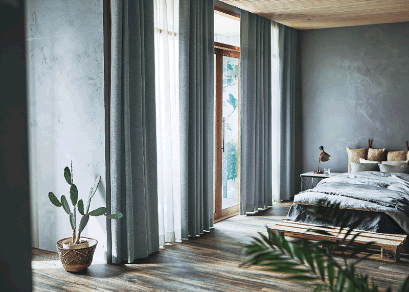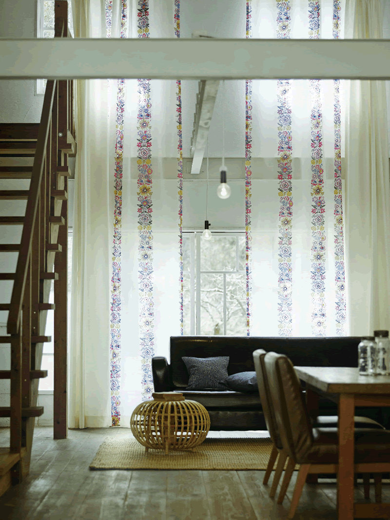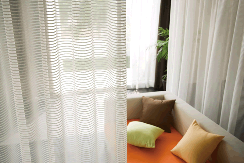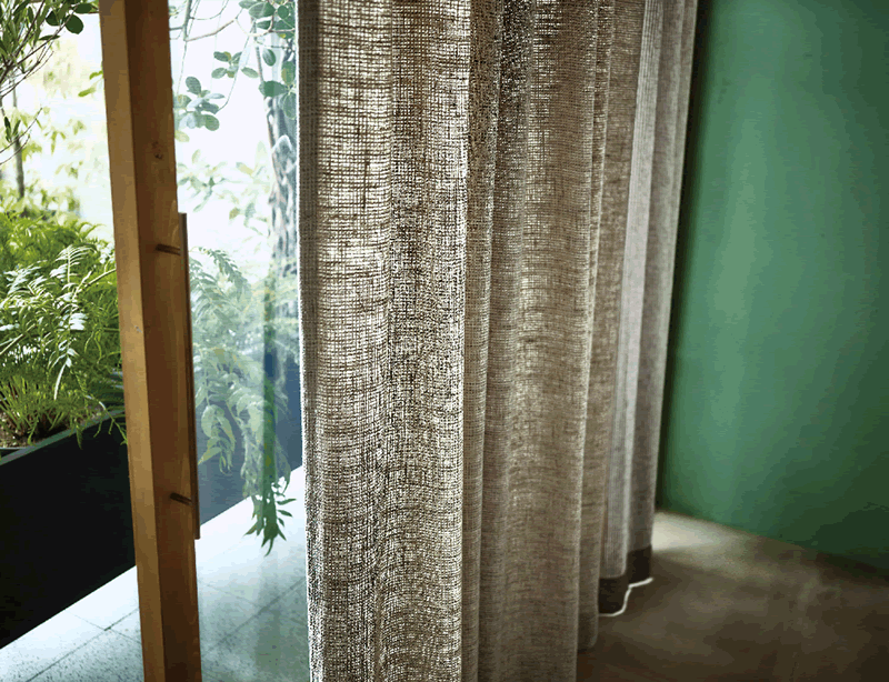 テクスチャーをプリントした視覚に遊びを加えたデザインのカーテンです。横のラインがエキゾチックでアジアンな印象です。