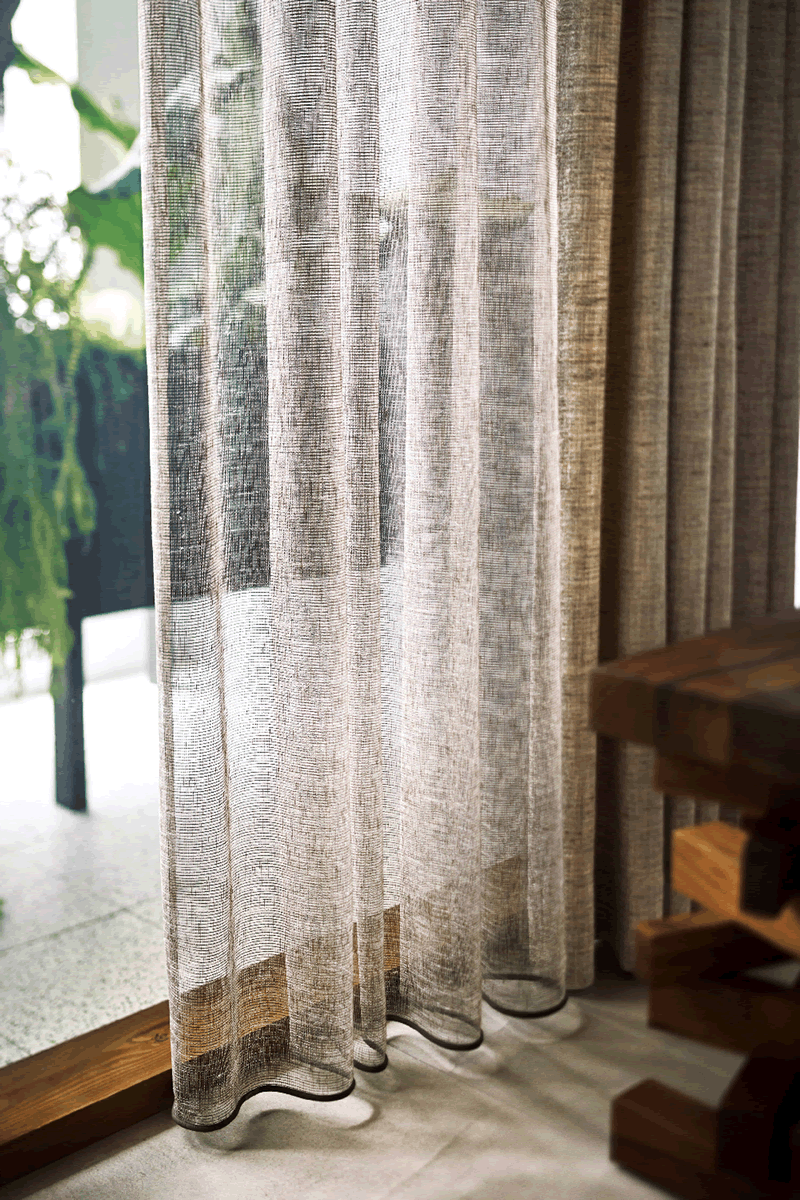 撚り方を工夫した杢糸を経糸に編んだナチュラルテイストでありながらモダンなシアーカーテンです。
